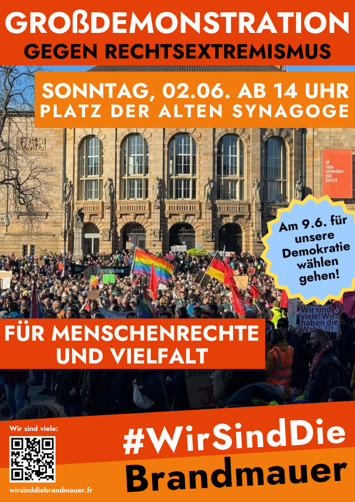 Großdemo gegen Rechtsextremismus in Freiburg: Sei am 2. Juni ab 14 Uhr dabei und werde laut für unsere Demokratie, Menschenrechte und eine vielfältige Gesellschaft. #WirSindDieBrandmauer