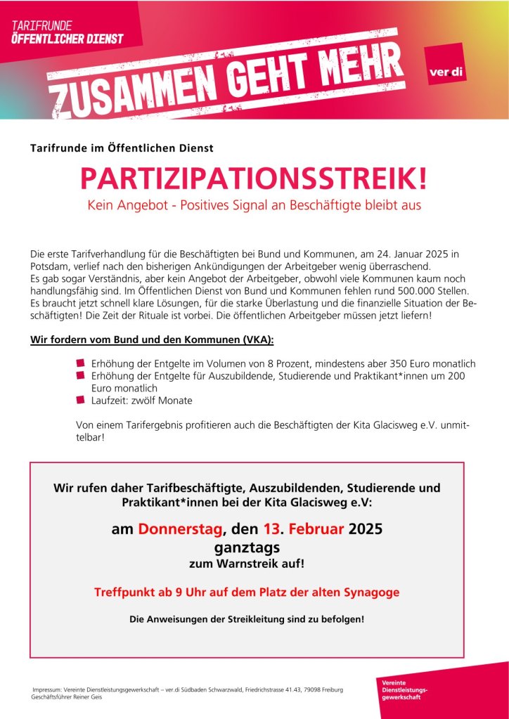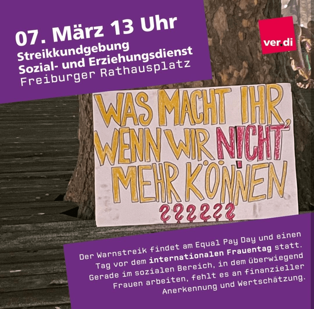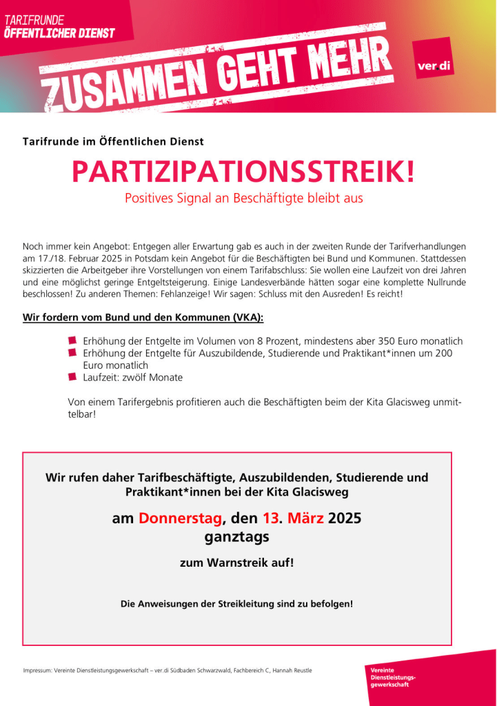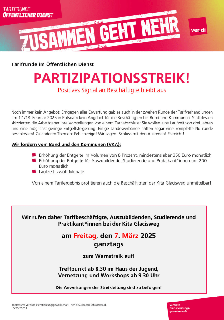 In Solidarität mit unseren Kolleg*innen im öffentlichen Dienst und um für eine bessere und gerechtere Bezahlung unseres Berufs als Erzieher*in zu kämpfen, legen auch wir, die Beschäftigten der Kita Glacisweg e.V., diesen Mittwoch, am Internationalen Feministischen Kampftag, unsere Arbeit nieder. Um unserem Streik Nachdruck zu verleihen, bleibt unsere Kita somit am 8. März 2023 ganztägig geschlossen.