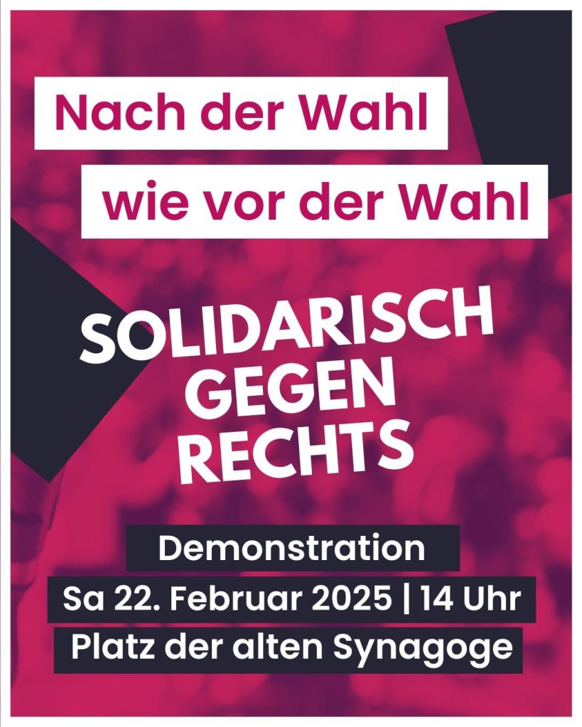 Wir wollen zeigen: Die Mehrheit steht für ein solidarisches Zusammenleben, Gleichberechtigung und eine Gesellschaft, in der Menschenleben und Menschenwürde zählen! Lasst uns gemeinsam am 22.02.2025 einen Tag vor der Wahl auf die Straße gehen und uns zusammen solidarisch gegen Rechts stellen! Bist du dabei?