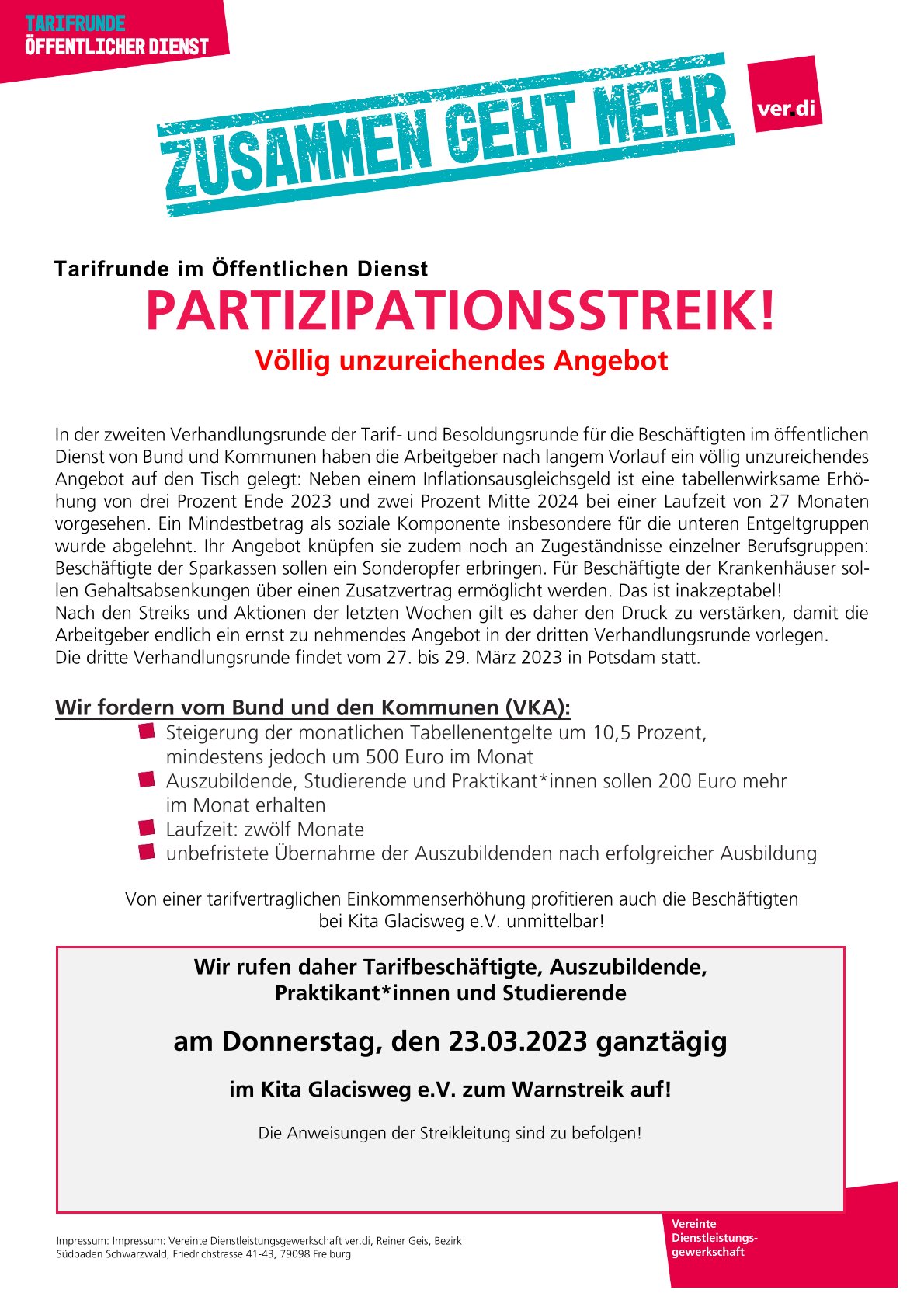In Solidarität mit unseren Kolleg*innen im öffentlichen Dienst und um für eine bessere und gerechtere Bezahlung unseres Berufs als Erzieher*in zu kämpfen, legen auch wir, die Beschäftigten der Kita Glacisweg e.V., diesen Mittwoch, am Internationalen Feministischen Kampftag, unsere Arbeit nieder. Um unserem Streik Nachdruck zu verleihen, bleibt unsere Kita somit am 8. März 2023 ganztägig geschlossen.